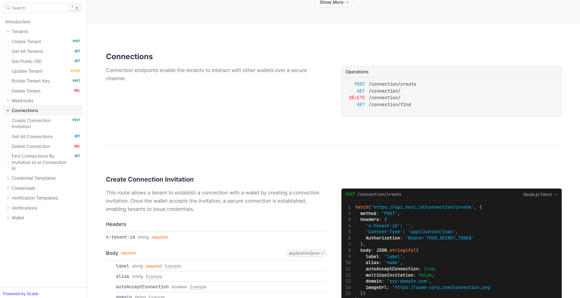 Hovi’s Connections endpoints allow you to create, delete, and retrieve connections, as well as access connection invitations. For more information, please visit here.