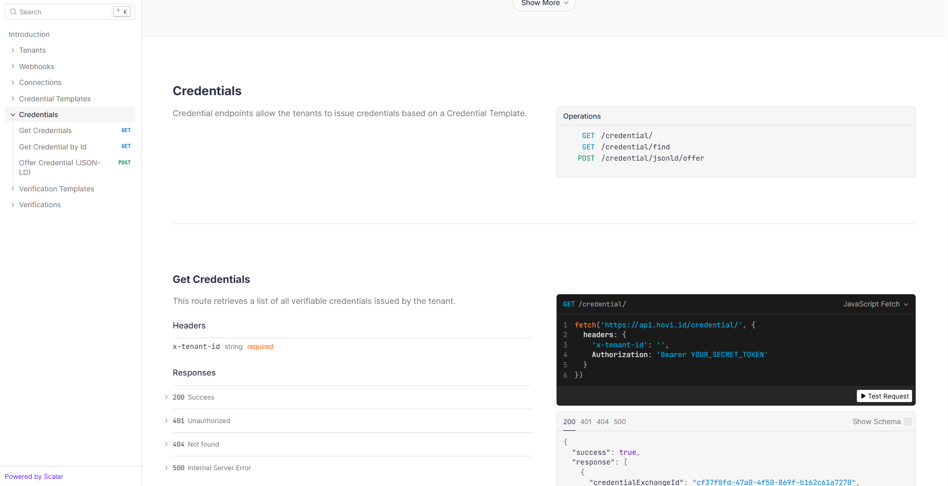 Hovi's Credentials endpoints enable tenants to issue verifiable credentials based on predefined Credential Templates. These endpoints can be used to retrieve and issue credentials that recipients or holders can store securely in digital wallets, such as the Hovi Wallet or any other supported wallet (refer to Hovi Supported Wallets). Once stored, the credentials can be shared with verifiers when needed.