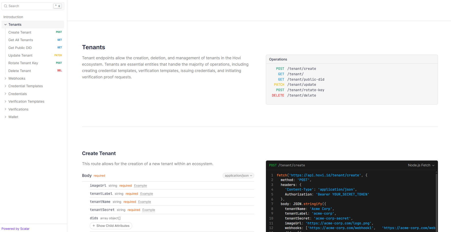 Hovi’s Organization endpoints enable you to create, update, delete, and retrieve tenants. Additionally, you can rotate a tenant's secret key and access public DIDs. For more information, please visit here.