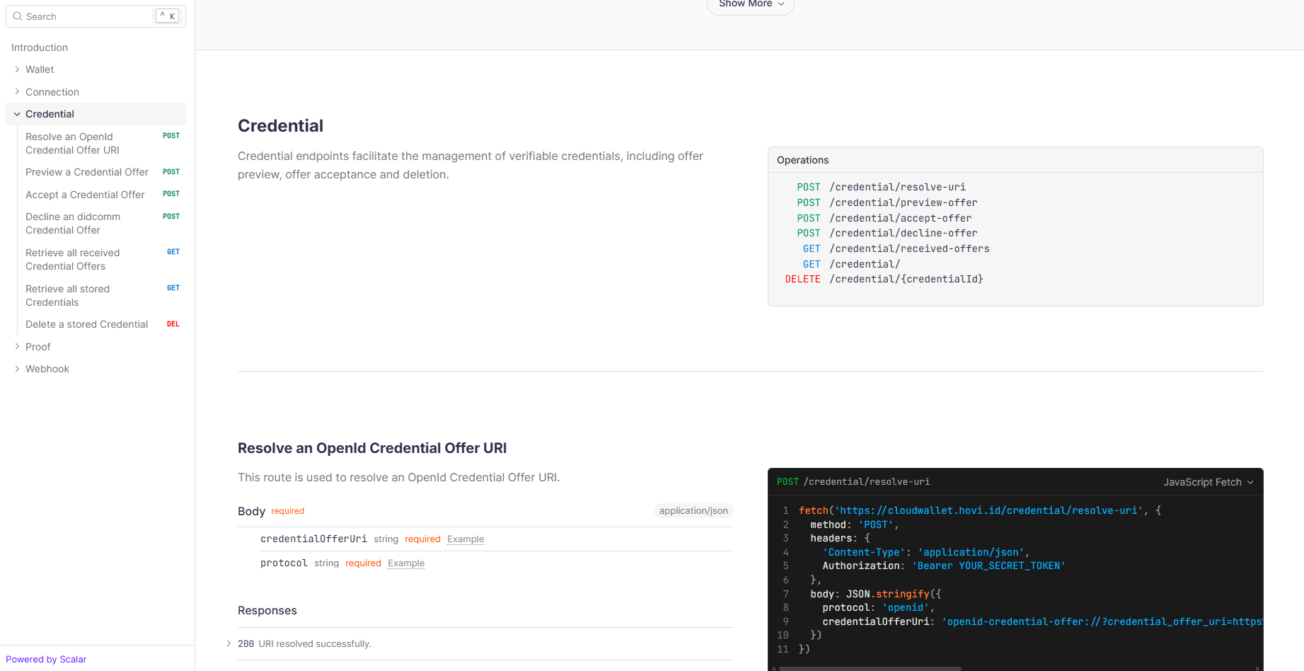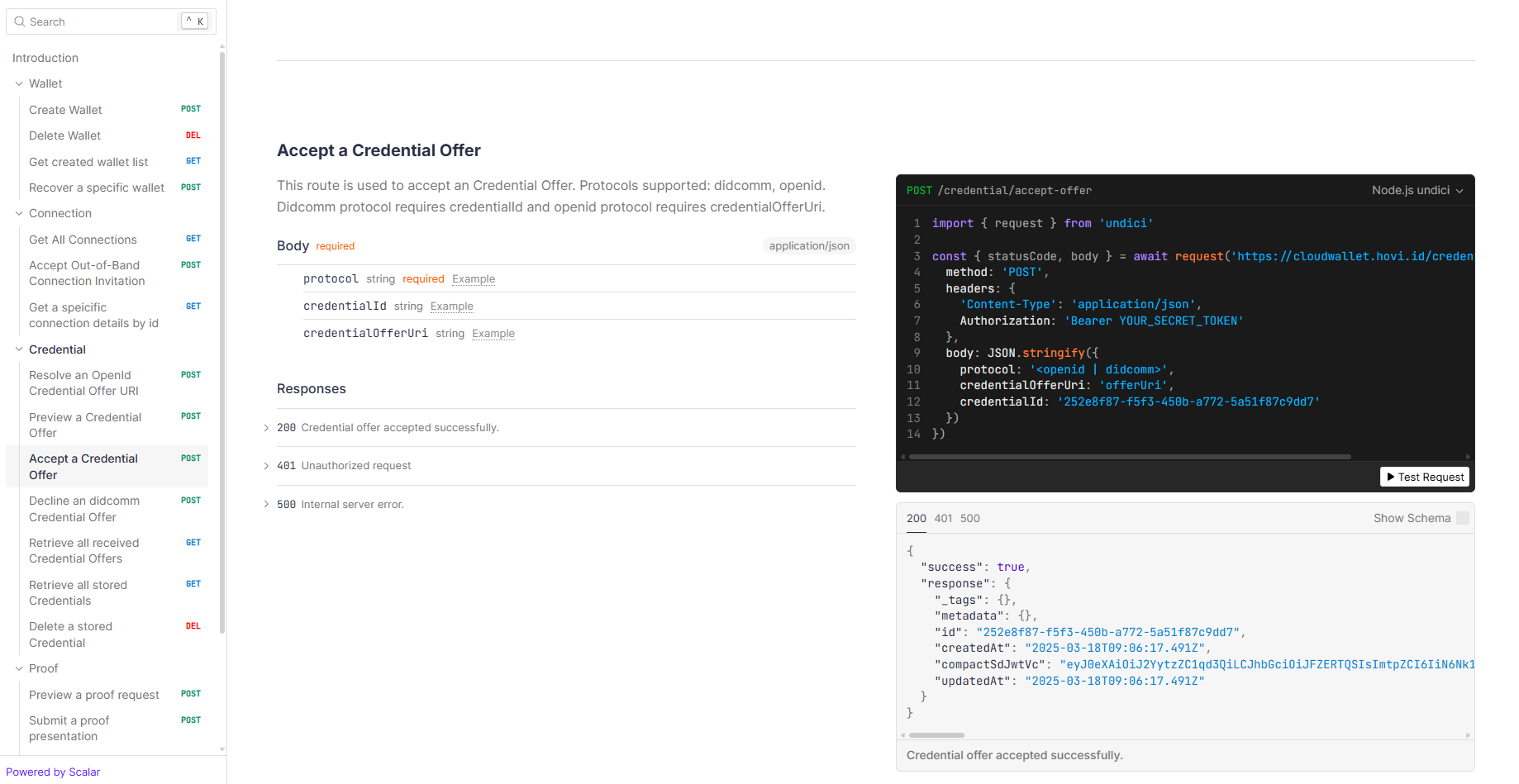 Hovi’s Wallet Credential endpoints enable you to preview, accept, decline, delete and retrieve credential information. For more information, please visit Hovi Cloud Wallet API Credential Reference.