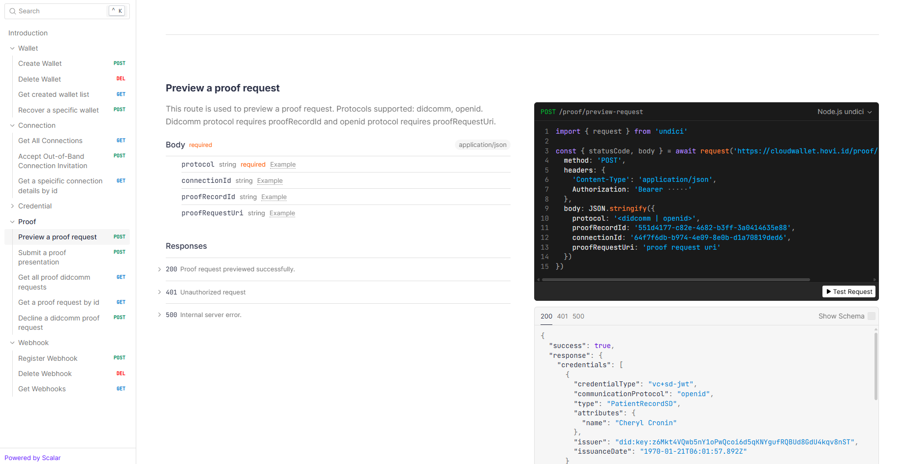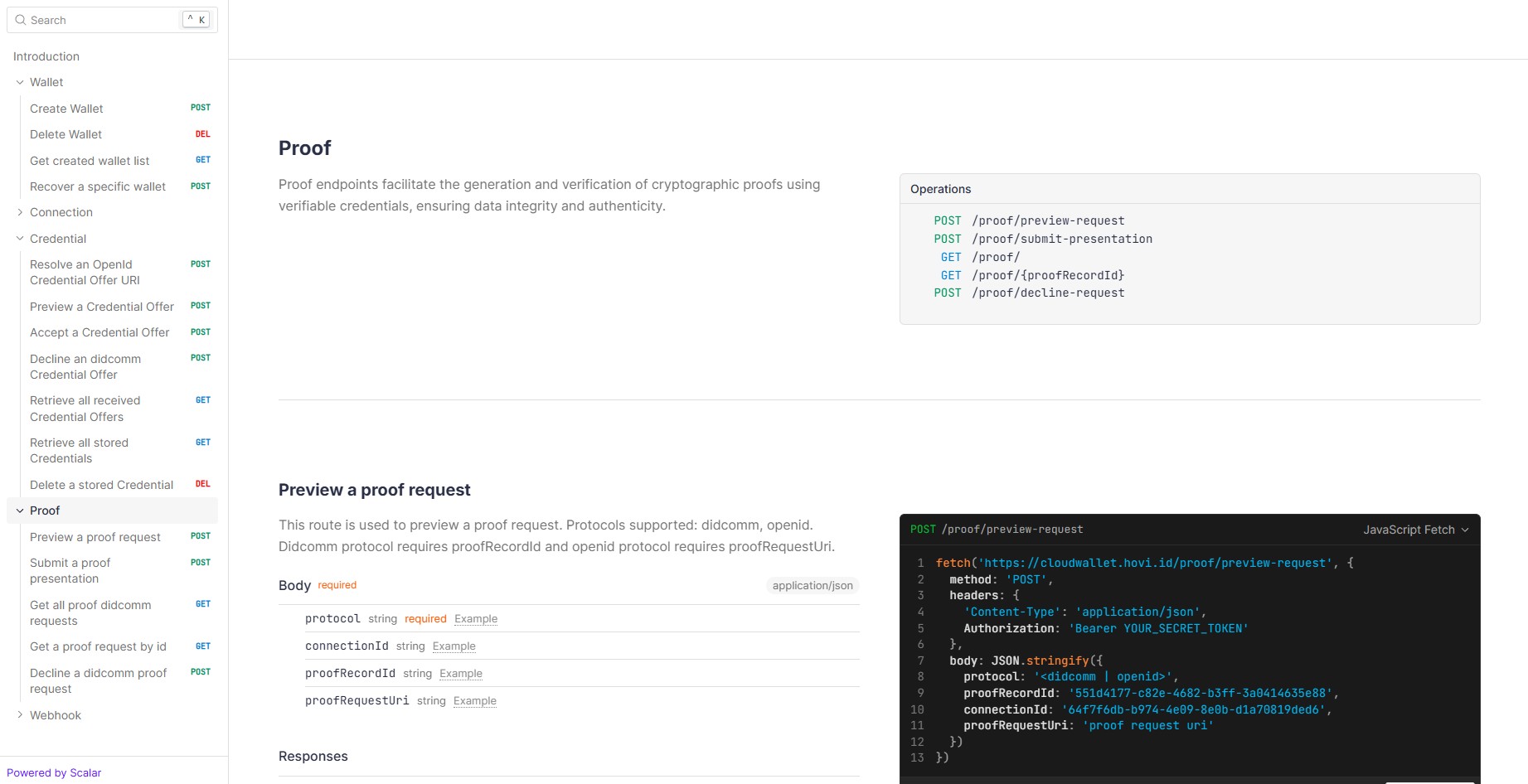 Hovi’s Proof endpoints enable you to preview, submit, decline, and retrieve proof information. For more information, please visit Hovi Cloud Wallet API Proof Reference.