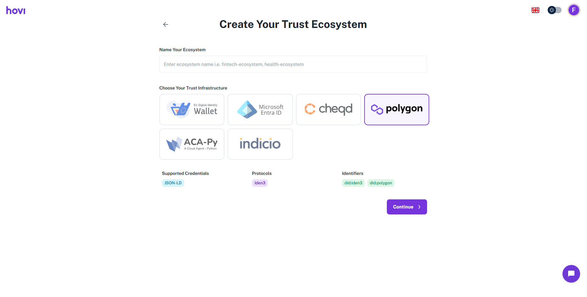 An Ecosystem in Hovi Studio refers to a self sovereign identity network where various tenants (organizations or entities) can securely interact, issue, and verify digital credentials.