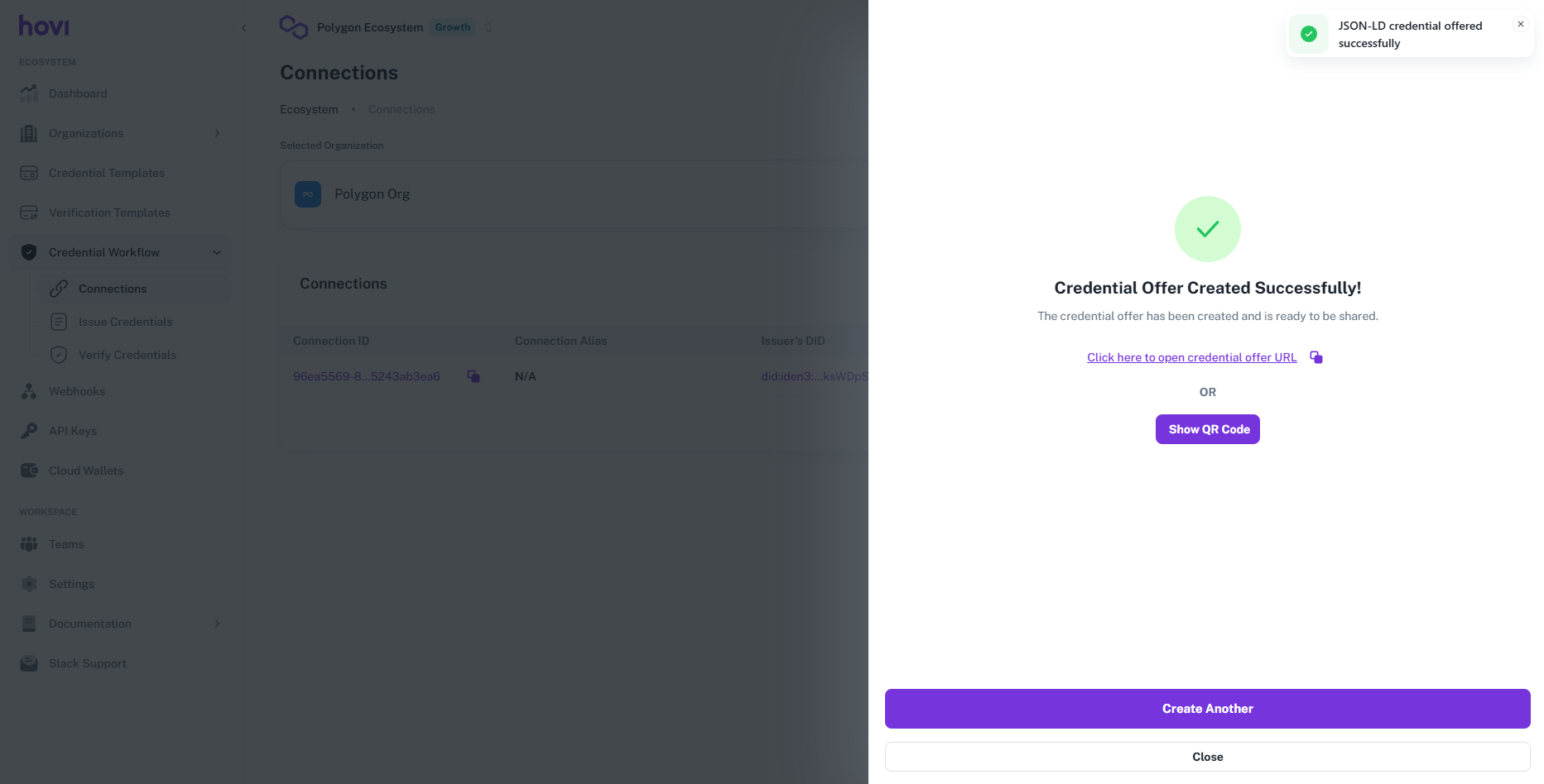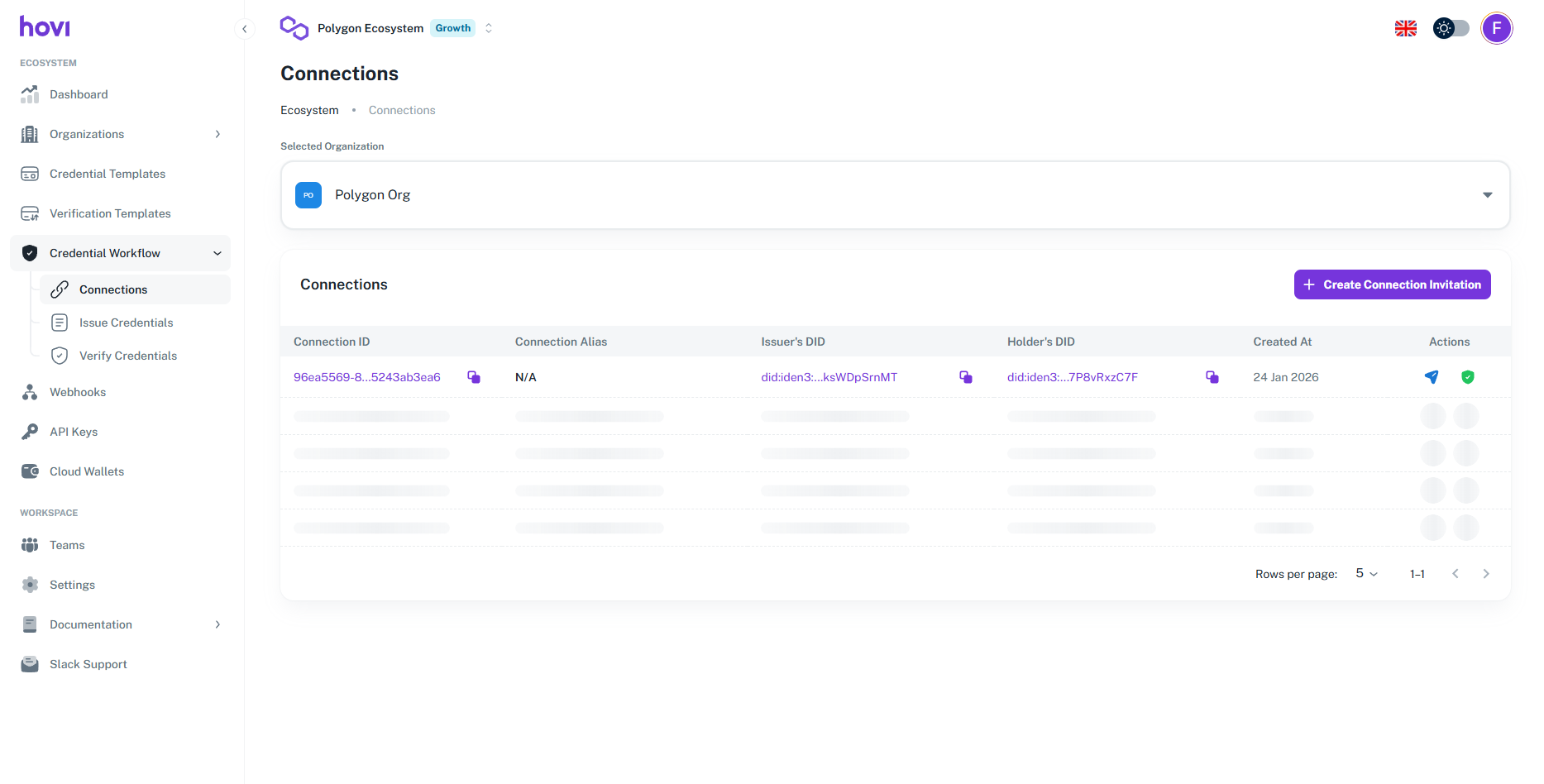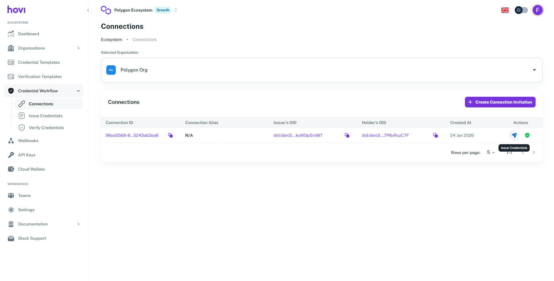 Hovi Studio provides an intuitive interface for issuing verifiable credentials to recipients through established connections. The Issue Credentials module allows tenants to seamlessly issue credentials based on predefined credential templates.