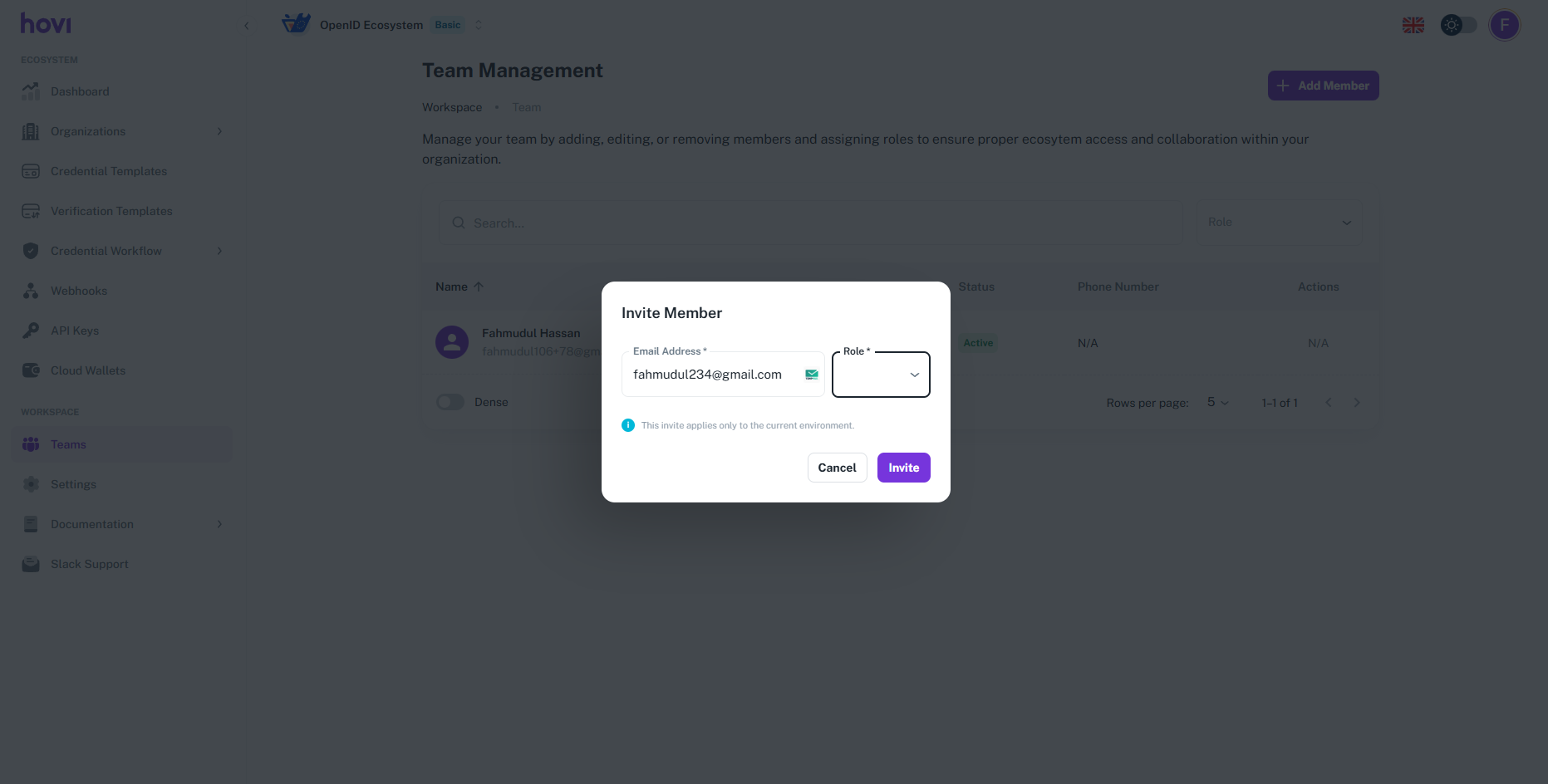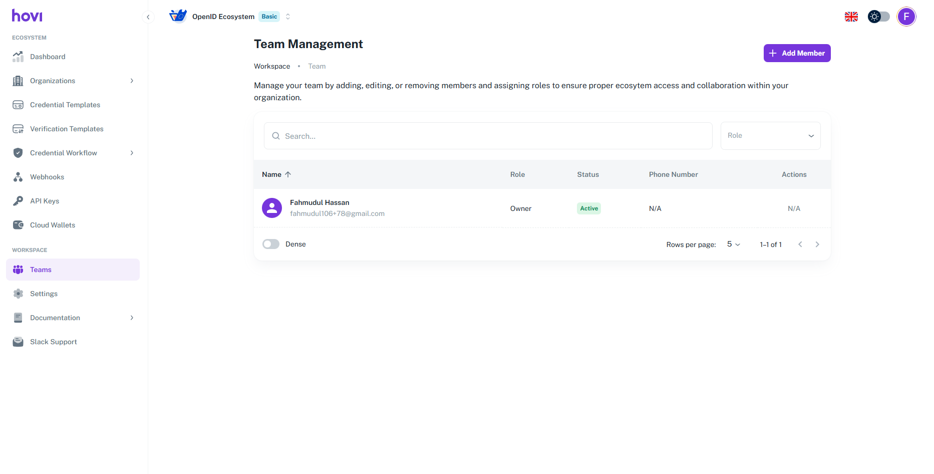 Manage your team within Hovi Studio by adding, editing, or removing members and assigning roles to ensure proper ecosystem access and collaboration within your organization. This ensures that the right members have appropriate access.