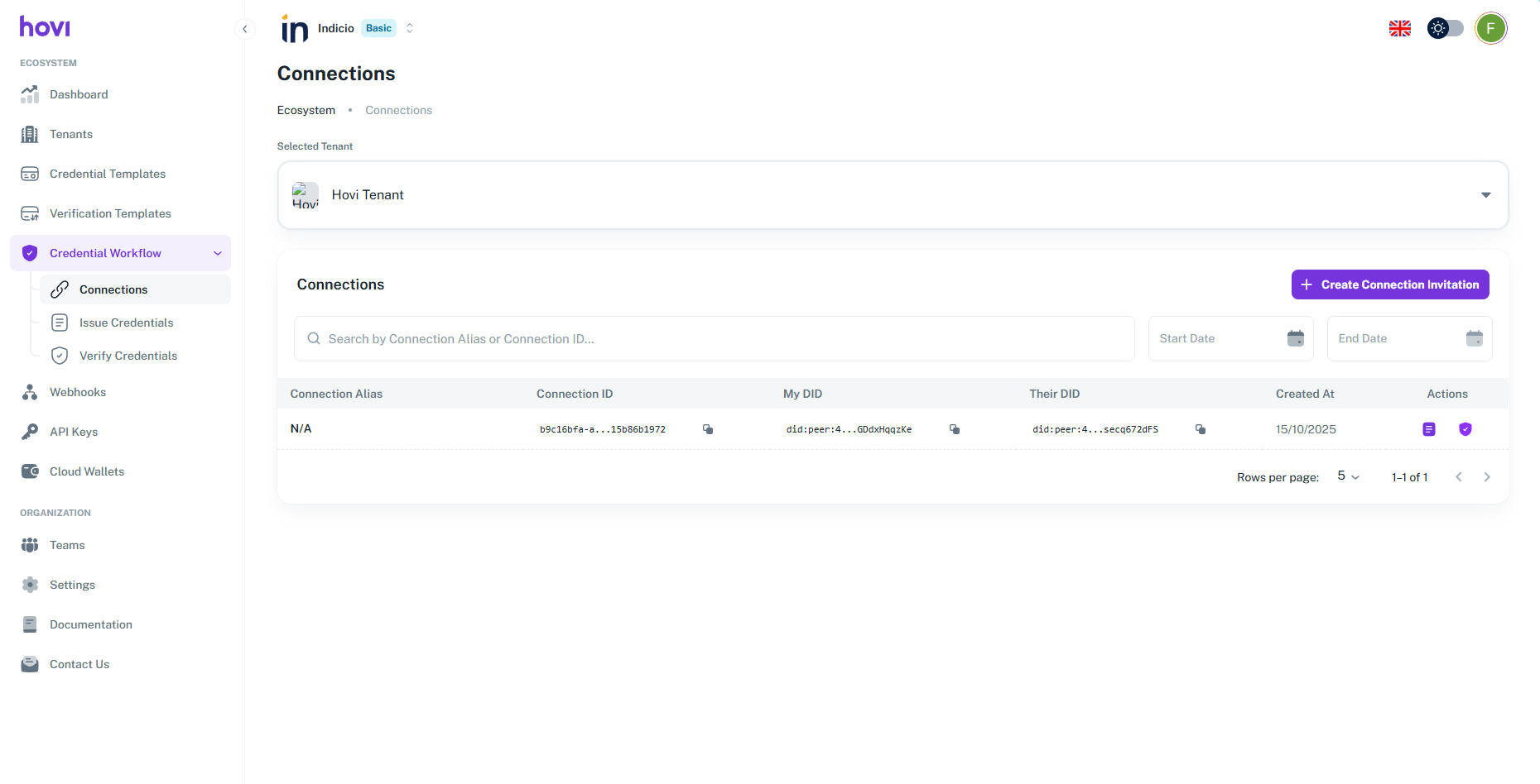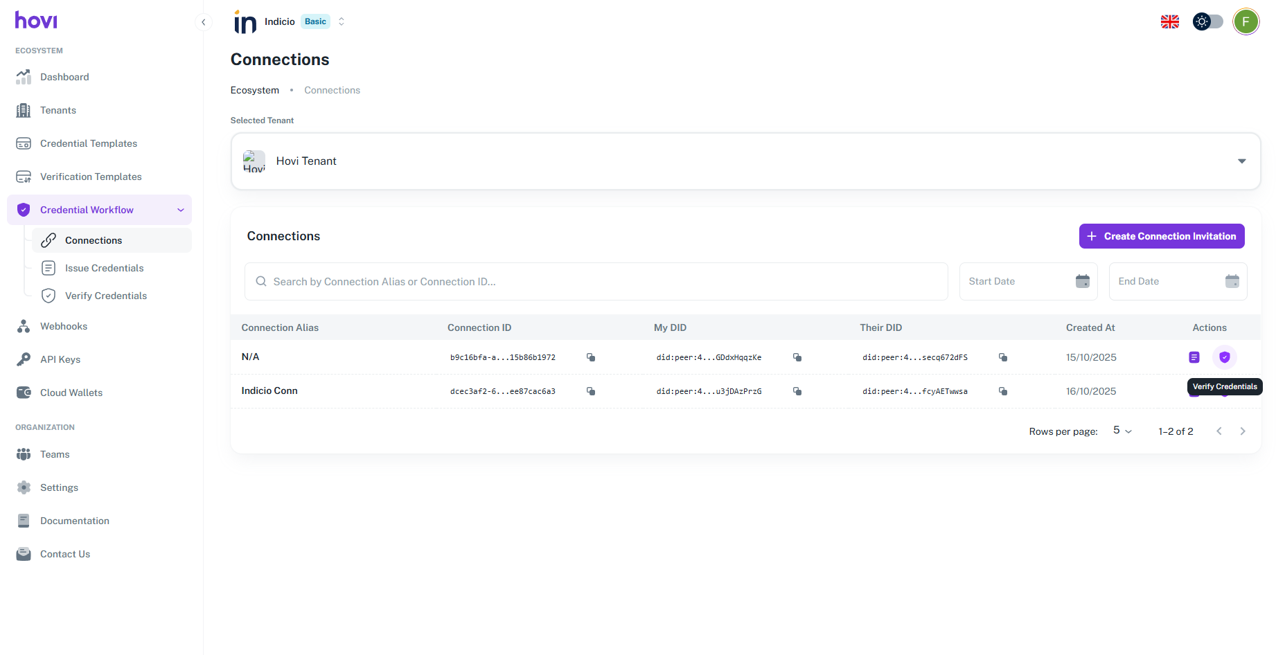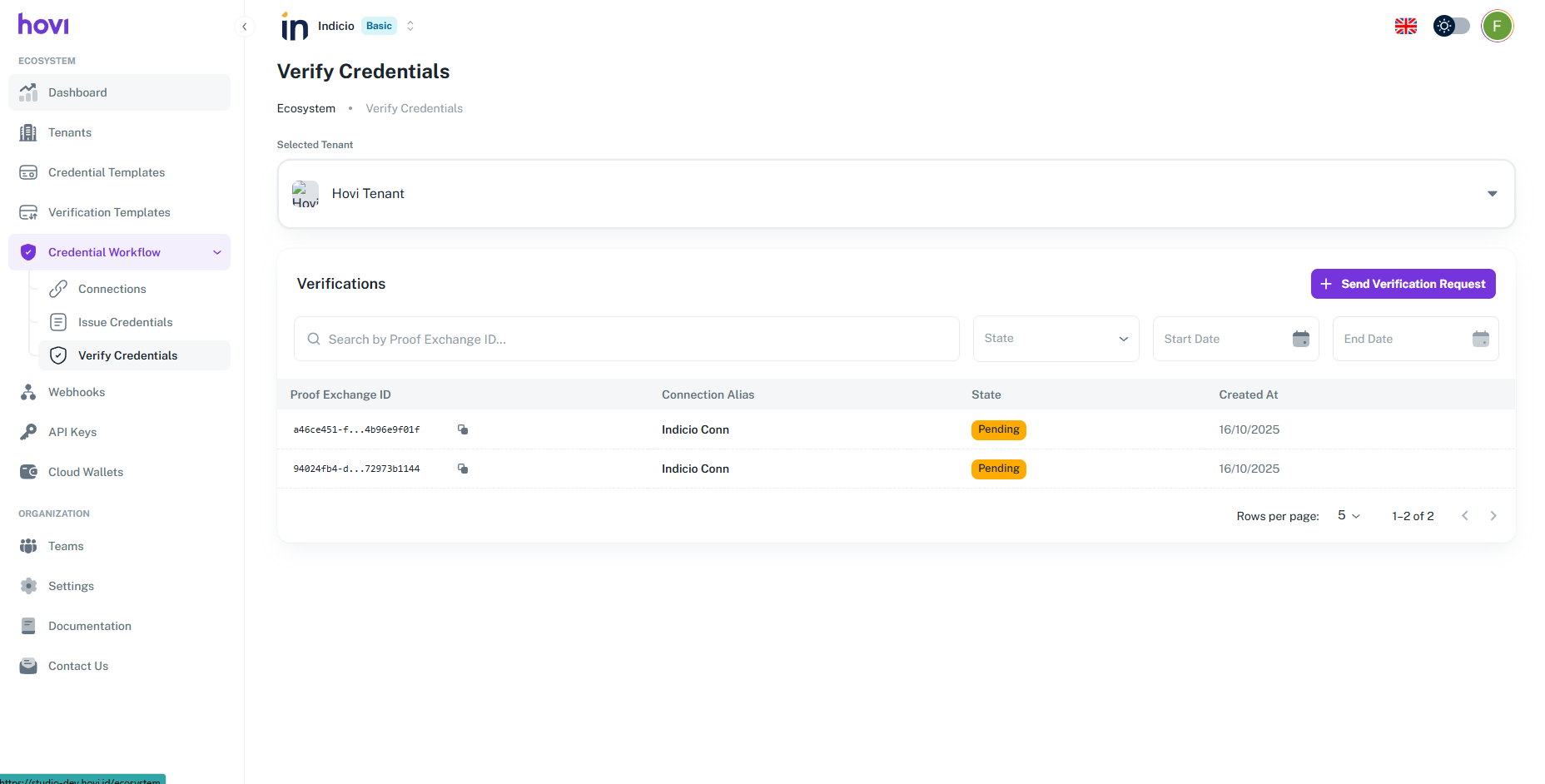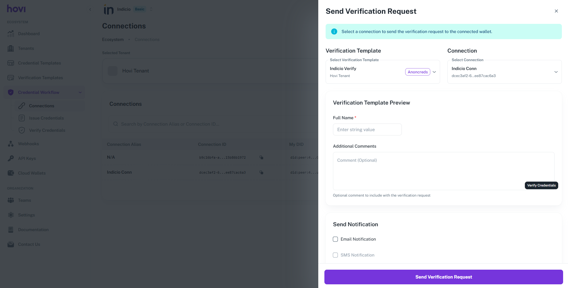 Hovi Studio provides an intuitive interface for verify credentials to recipients through established connections. The Verify Credentials module allows tenants to seamlessly verify credentials based on predefined verification templates.