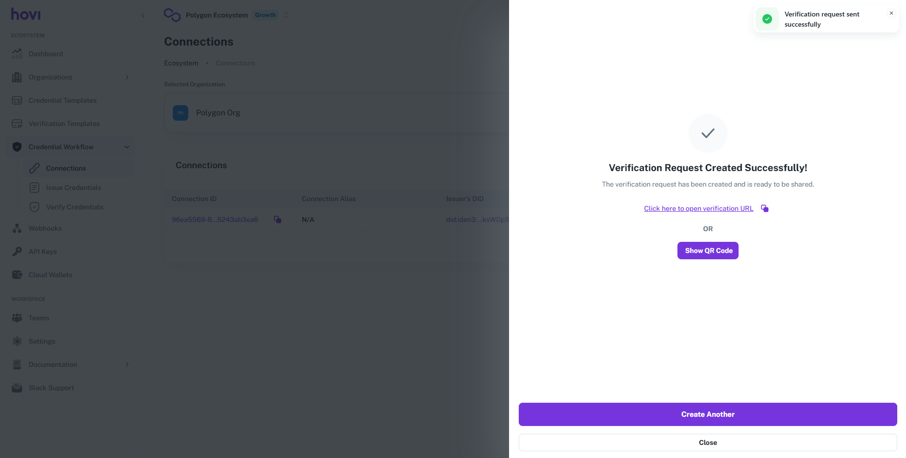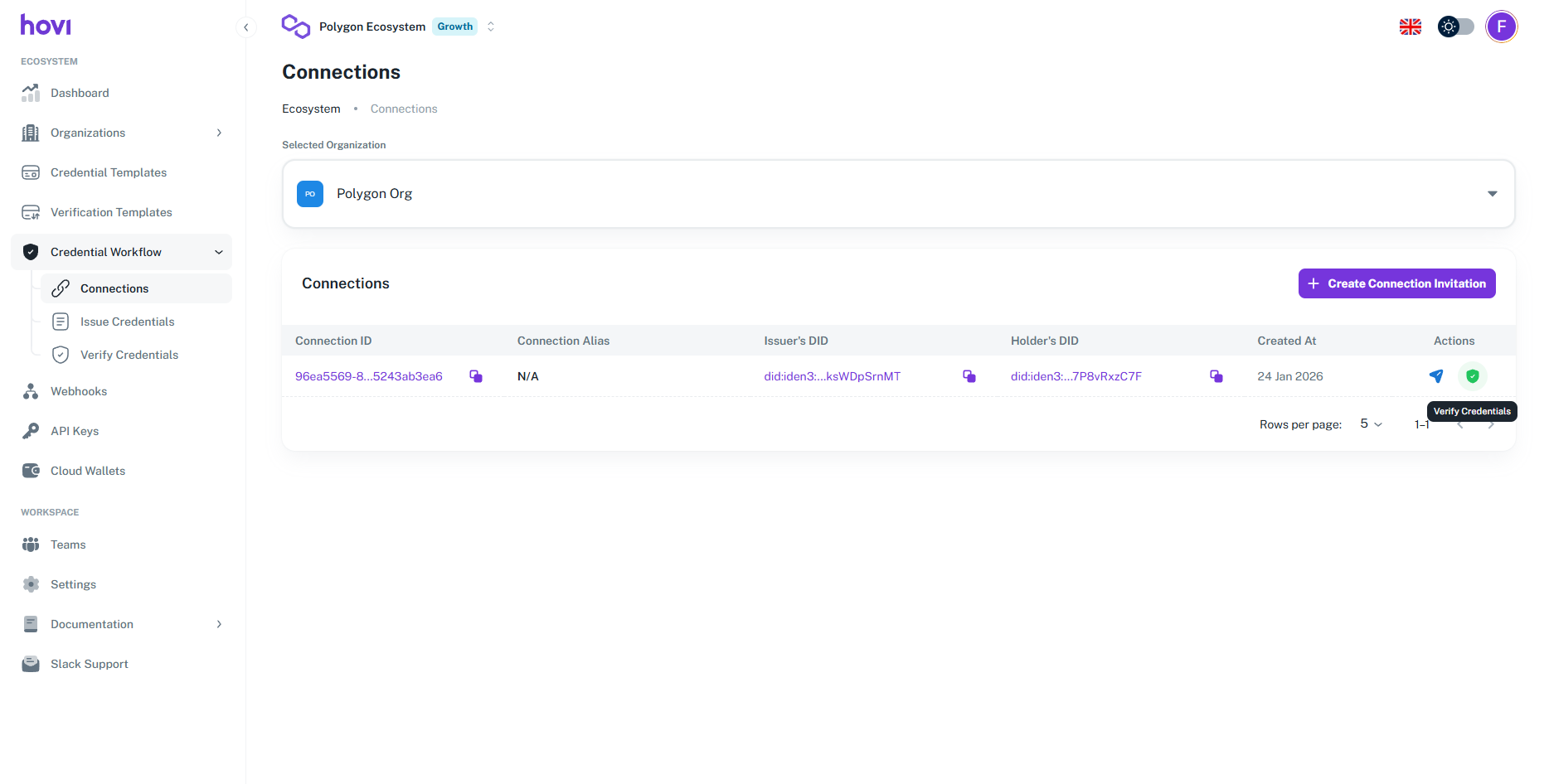 Hovi Studio provides an intuitive interface for verify credentials to recipients through established connections. The Verify Credentials module allows tenants to seamlessly verify credentials based on predefined verification templates.
