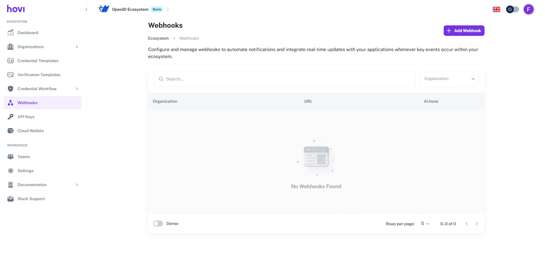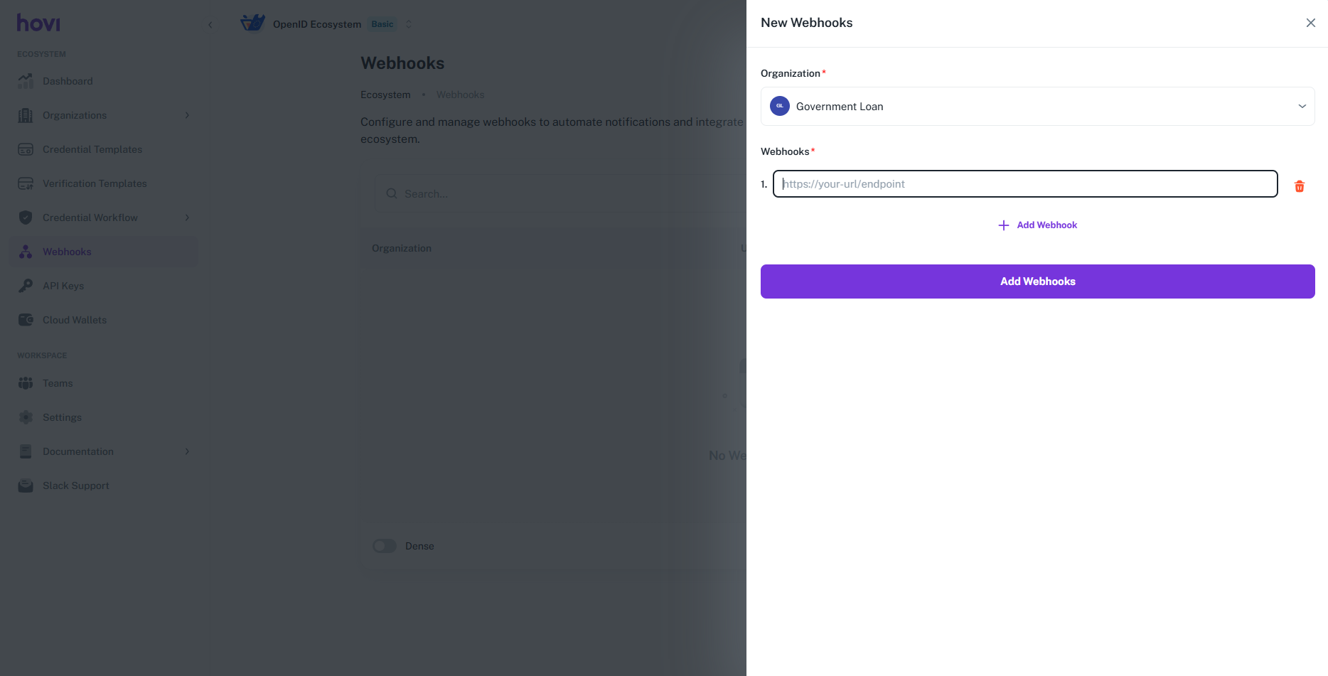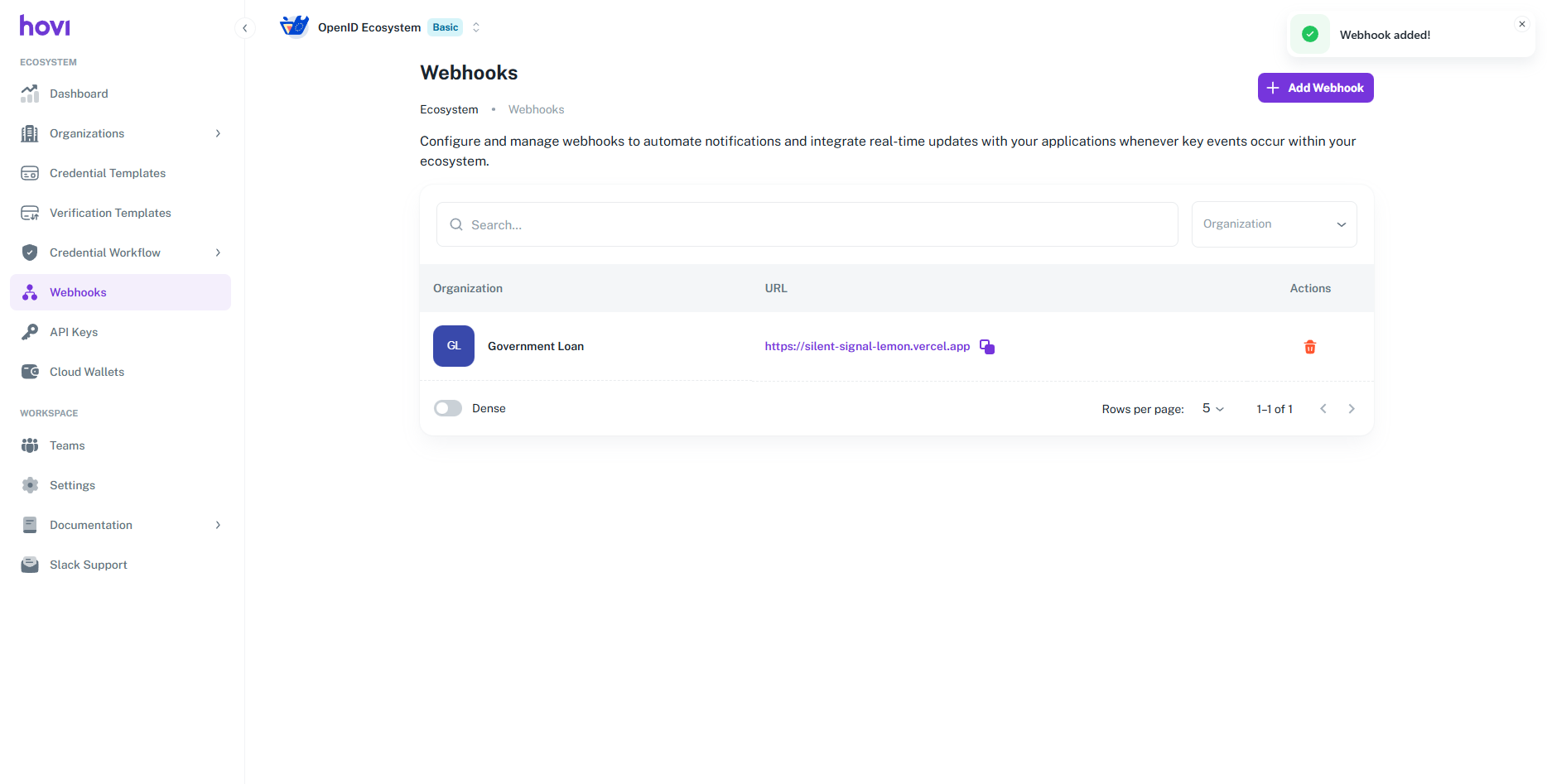 View Webhooks: The Webhooks tab will display a list of existing webhook URLs along with the corresponding organization names. Here, you can view and manage your webhooks.